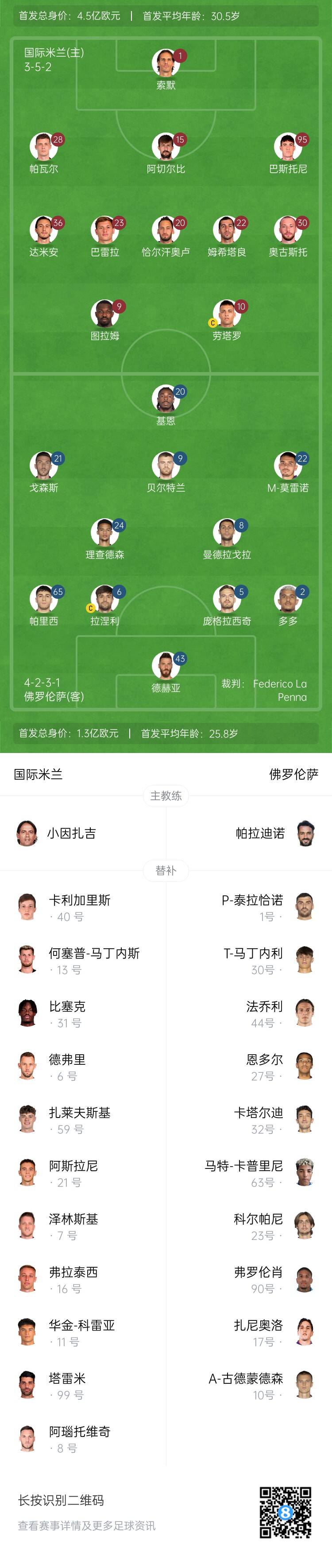 2月11日訊 意甲第24輪,國(guó)米主場(chǎng)對(duì)陣佛羅倫薩。賽前,官方公布了本場(chǎng)的首發(fā)名單。