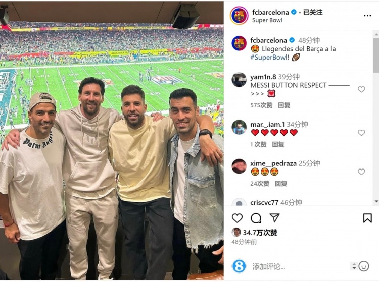 梅西、蘇亞雷斯、阿爾巴、布斯克茨一起觀看了比賽,巴薩社媒曬出四人的合照,配文:“巴薩傳奇在超級(jí)碗?!?/p>