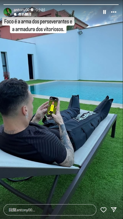 安東尼社媒曬出自己在泳池邊躺椅上恢復的照片,配文:“專注是堅持者的武器,也是勝利者的鎧甲?!?/p>
