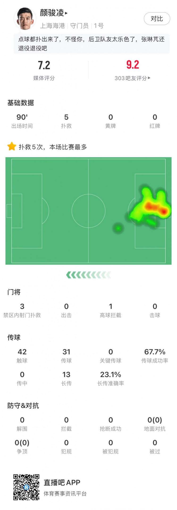 盡力局!顏駿凌撲點(diǎn)&全場5次撲救,賽后評分7.2隊(duì)內(nèi)最高