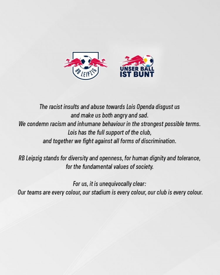 萊比錫寫道:“對奧蓬達種族主義性質(zhì)的侮辱令我們作嘔,也讓我們感到憤怒且難過。我們用最強烈的方式譴責(zé)種族歧視和不人道行為。俱樂部會全力支持奧蓬達,我們也會團結(jié)一致與所有形式的歧視作斗爭?!?/p>