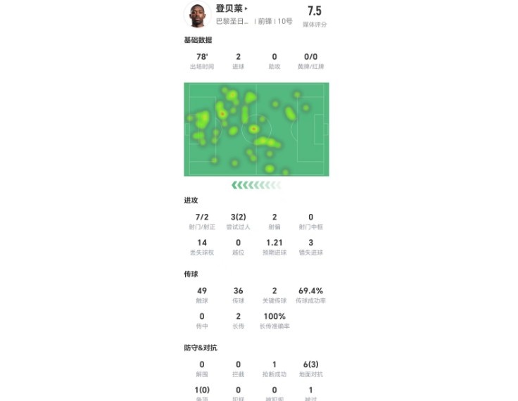 技術(shù)統(tǒng)計(jì)數(shù)據(jù)顯示,登貝萊本場(chǎng)比賽7射兩正,3次過人兩次成功,3次錯(cuò)失重大機(jī)會(huì)。另外,登貝萊有兩次關(guān)鍵傳球,兩次長(zhǎng)傳全部成功。