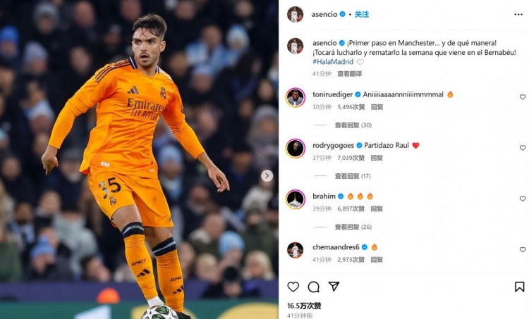 因傷缺席的皇馬中衛(wèi)呂迪格也現(xiàn)身評論區(qū),并以搞怪方式送上鼓勵:“Aniiiiiaaaannniiiimmmmal????”,可能是用英語形容勞爾-阿森西奧的表現(xiàn)堪稱野獸(animal)。