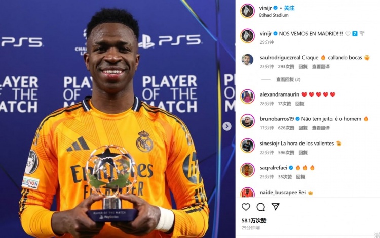 2月12日訊 皇馬在本輪歐冠客場3-2逆轉(zhuǎn)曼城,維尼修斯表現(xiàn)搶眼并當(dāng)選全場最佳球員。
