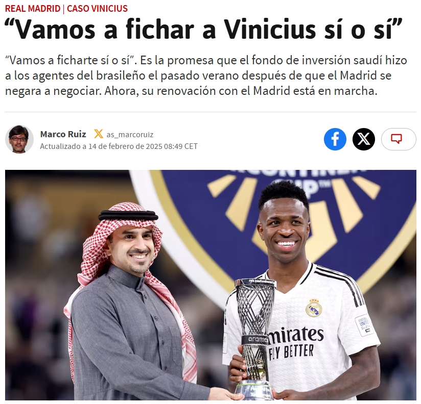 02月14日訊 維尼修斯與沙特聯(lián)賽的轉(zhuǎn)會傳聞愈演愈烈,《阿斯》透露了新的消息。