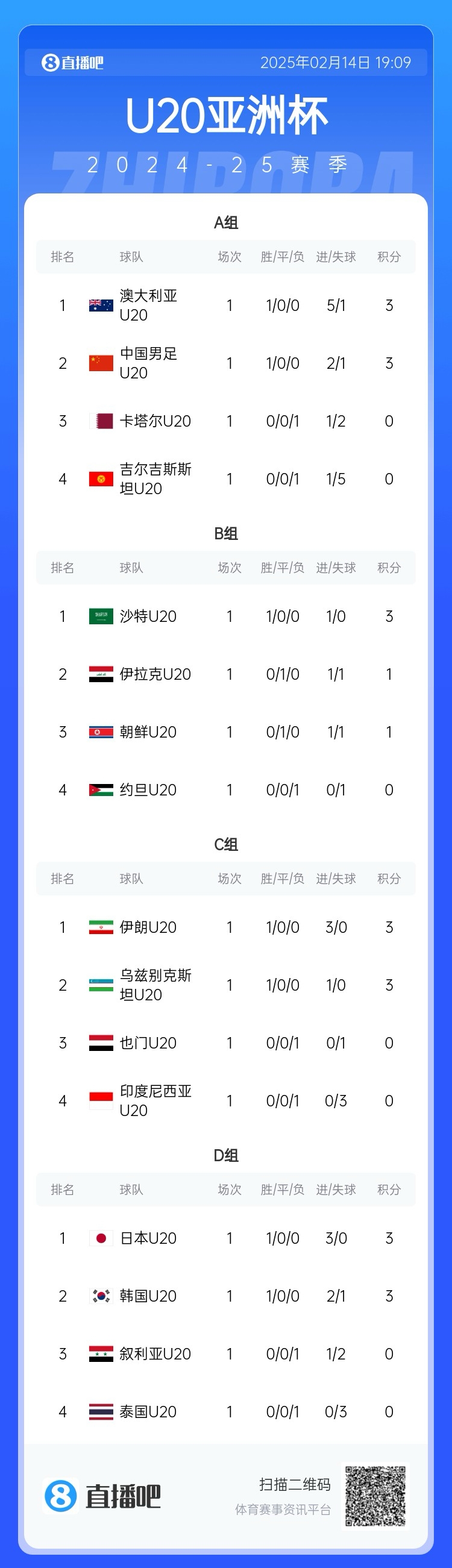 02月14日訊 U20亞洲杯D組首輪今日戰(zhàn)罷,賽后D組積分榜形勢(shì)如圖。日韓均獲開(kāi)門紅分列前兩名,泰國(guó)下輪若輸給韓國(guó)將提前出局。 標(biāo)簽: 足球 中超 中國(guó)足球 國(guó)家隊(duì)