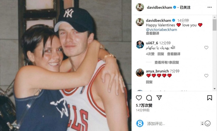 2月14日訊 貝克漢姆更新社媒動態(tài),慶祝情人節(jié)。
