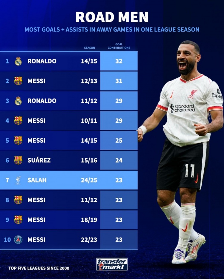 2月15日訊 德轉(zhuǎn)統(tǒng)計(jì)了2000年后在單賽季聯(lián)賽客場(chǎng)比賽中制造進(jìn)球榜單,本賽季的薩拉赫已經(jīng)制造了23球,距離C羅保持的紀(jì)錄還差9球。
