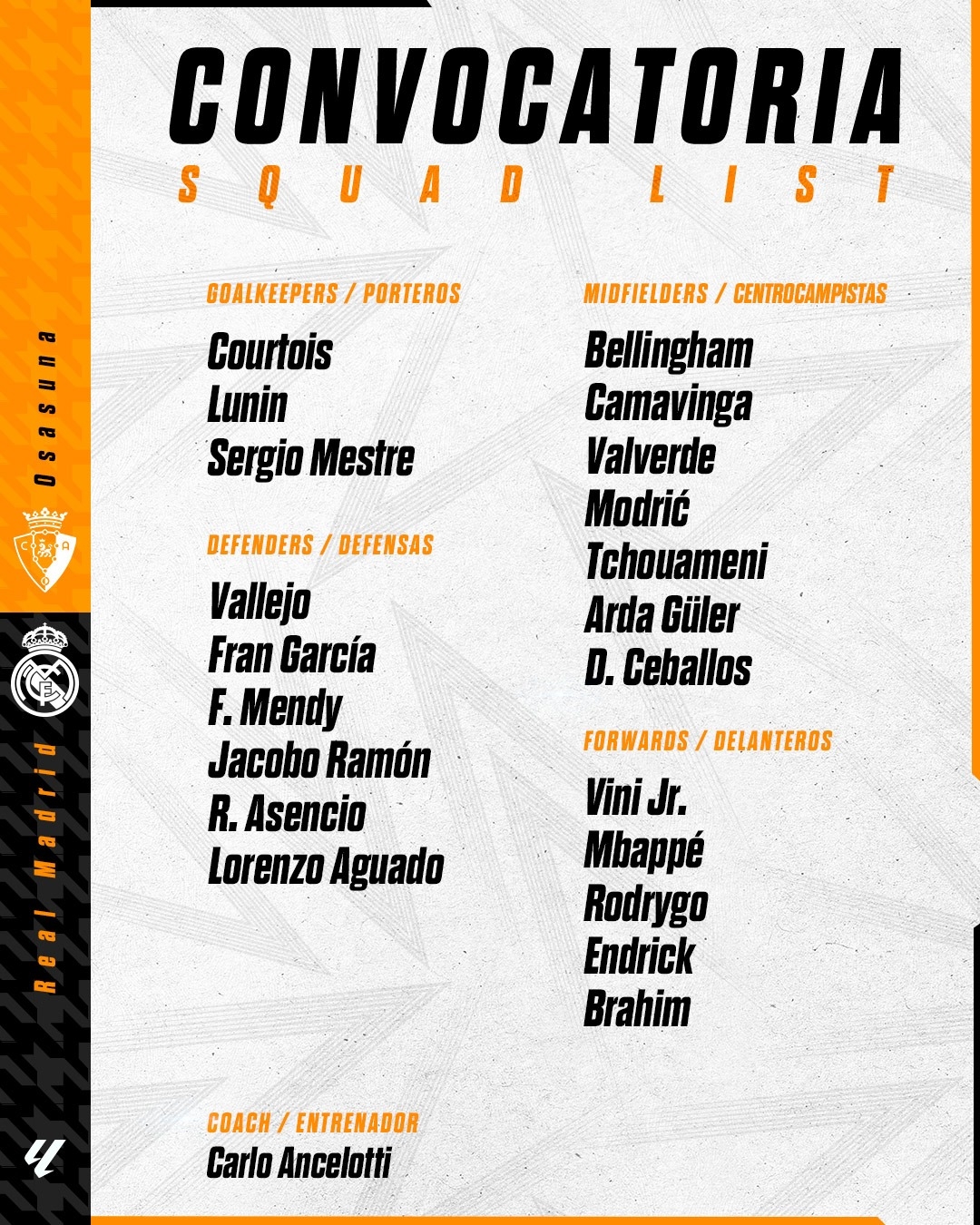 2月15日訊 在本輪西甲聯(lián)賽的一場比賽中,皇馬將赴客場對(duì)陣奧薩蘇納,賽前,皇馬公布了本場比賽的球員大名單,如下: