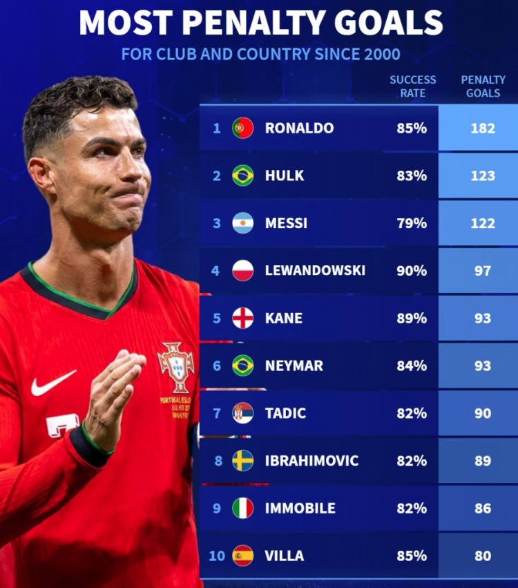 2月15日訊 《轉(zhuǎn)會市場》統(tǒng)計了新世紀俱樂部+國家隊點球進球榜,C羅居首。
