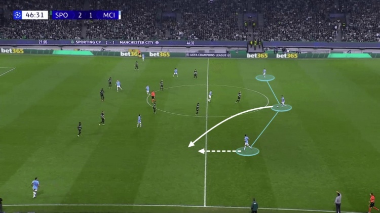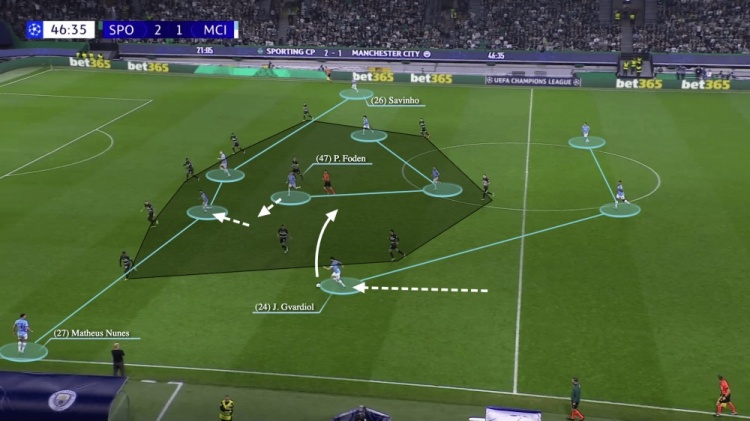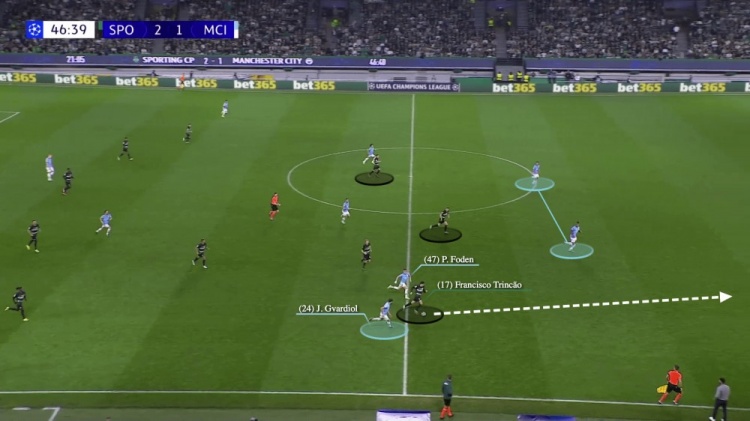 最明顯的例子是對陣葡萄牙體育的比賽。曼城在下半場一開始就失誤了,一個簡單的二過一足以讓貢薩爾維斯從他們的中場身后進入。他傳球給邊后衛(wèi)馬克西米利亞諾-阿勞霍,然后皮球越過了埃德森把守的大門。阿勞霍破門后僅86秒,葡萄牙體育就獲得了一個點球。從開球開始,曼城就立即轉(zhuǎn)變?yōu)?-1-3-3陣型來對陣葡萄牙體育的五后衛(wèi)。阿坎吉將球傳給了格瓦迪奧爾,后者在理論上來說是有足夠向前推進的空間。