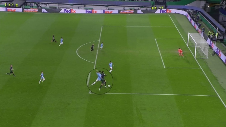 他有三個合理的選擇:傳給馬修斯-努內(nèi)斯,或者將球轉(zhuǎn)移到右路的薩維尼奧,亦或者向后傳遞。但格瓦迪奧爾都沒有選,而是選擇了最困難的路線,傳球給身處重兵集結(jié)區(qū)域的福登,而且他還沒有足夠的傳球精度。葡萄牙體育獲得了球權(quán),立即進入了格瓦迪奧爾推進留下的空間。