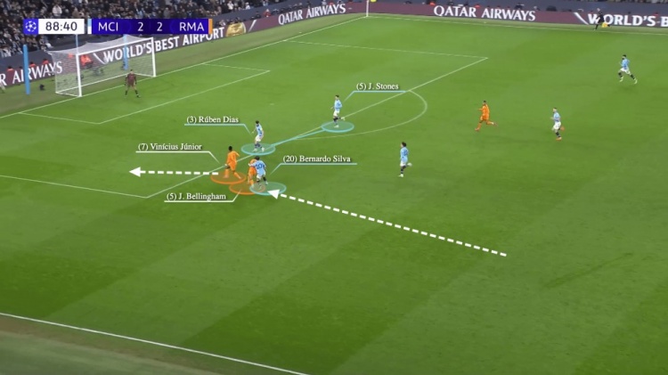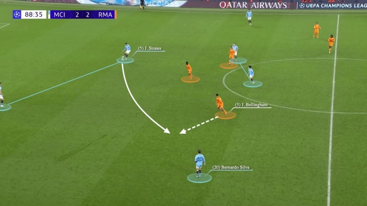甚至在對陣皇馬的比賽中,此前一直很可靠的斯通斯,也出現(xiàn)了失誤。他在比賽中扮演6號角色,在開局后移動到了左中后衛(wèi)的位置上。他傳球給貝爾納多-席爾瓦,就不是一個合適的選擇。貝林厄姆攔截了這次傳球,并帶球向前推進,貝爾納多-席爾瓦在禁區(qū)外將其包夾,但這一次并沒有判罰。