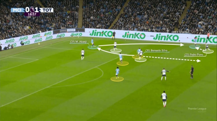 面對熱刺的壓迫,京多安傳球給貝爾納多-席爾瓦,又傳球給阿坎吉。這里的問題是,所有三名中場球員(下圖黃點)都靠得太近了,并且都是為球而戰(zhàn)——熱刺只需要兩名球員都能夠防住他們。當阿坎吉傳球給格瓦迪奧爾之時,貝爾納多-席爾瓦確實完成了一次滲透跑動,但曼城的慢速進攻讓熱刺鎖定了他們。