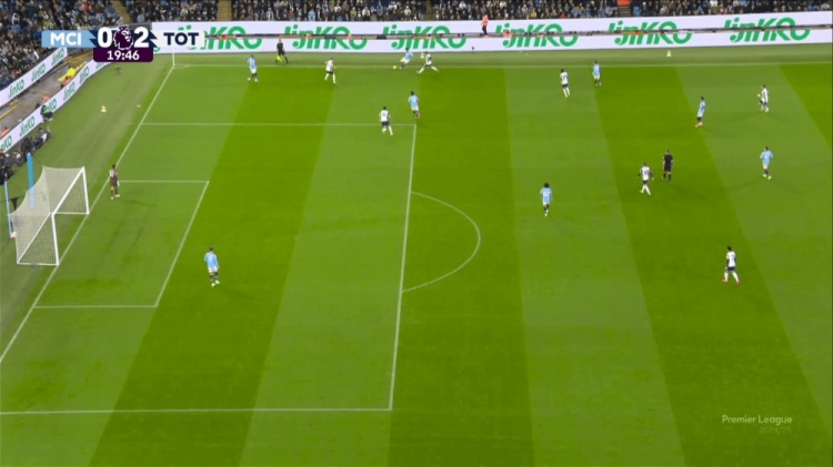 這其中一個復(fù)雜的問題在于右后衛(wèi)凱爾-沃克的位置。他在邊線附近,也沒有出現(xiàn)在上圖之中。這樣的寬度對于曼城這樣的球隊確實是非常重要的,但一旦出現(xiàn)失誤,就會給對手留下很大的進攻空間。也正是因為如此,熱刺僅用兩次傳球就制造了一對一的機會。