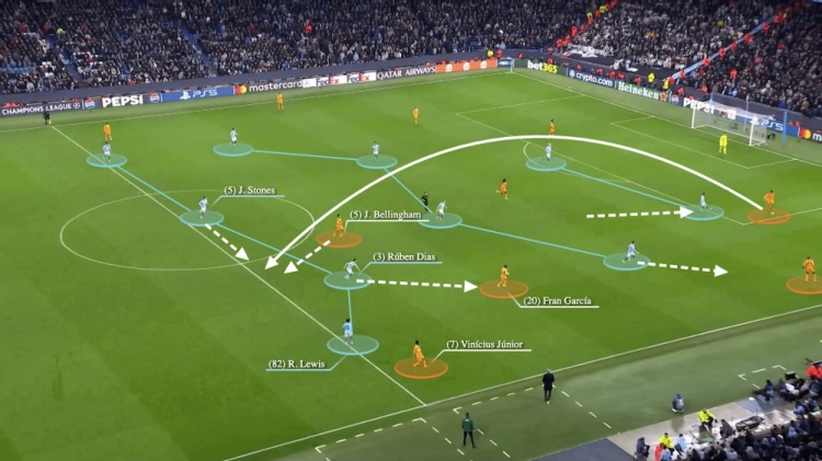 理想情況下,斯通斯和魯本-迪亞斯會形成默契的配合。雖然魯本-迪亞盯著弗蘭-加西亞,并試圖后撤,但斯通斯出現(xiàn)在一個更靠后的位置,使得貝林厄姆并沒有被緊盯,有了一個向前的機會。