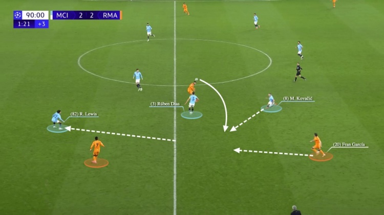 然而曼城的防守調(diào)整還是出現(xiàn)了失誤,因為皇馬用弗蘭-加西亞換下了姆巴佩。皇馬以短傳為主,并在曼城逼搶之時改用長傳推進。