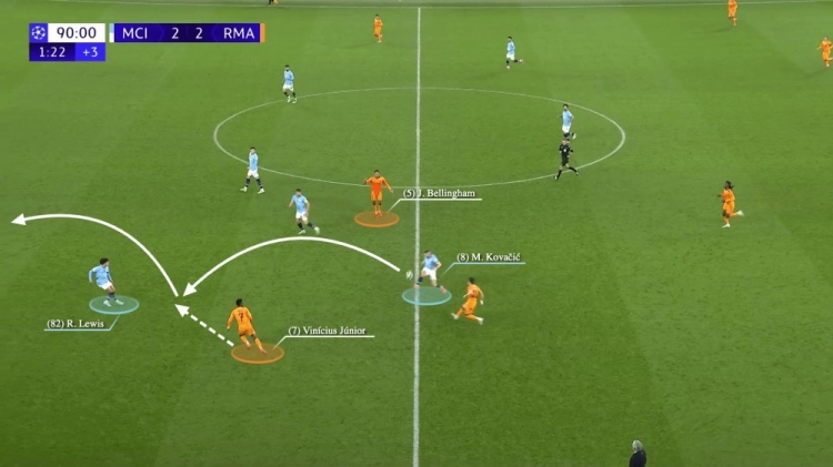 盡管科瓦西奇回過神來,完成了一次搶斷,但獲得球權(quán)之后的他,應(yīng)該將這個球直接送到前場,或者回傳給埃德森。相反,他將球傳給了劉易斯,且傳球并沒有成功。維尼修斯率先得到了球,并突破劉易斯,快速向前推進。