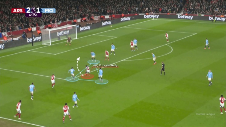 曼城的三名中場球員——里科-劉易斯、貝爾納多-席爾瓦和京多安——都已經(jīng)回收到了禁區(qū)附近,京多安將球帶到了禁區(qū)邊緣。貝爾納多-席爾瓦和格瓦迪奧爾則在邊路活動。