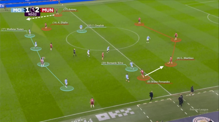 他們在中路的防守很緊湊,但曼聯(lián)并沒有施加什么壓力。替補出場的貝爾納多-席爾瓦不確定是否是向利桑德羅-馬丁內(nèi)斯施壓,還是等待布魯諾-費爾南德斯的跑動——后者在邊路游弋。下面這個瞬間,我們能明顯看到哈蘭德希望貝爾納多-席爾瓦能夠施壓。