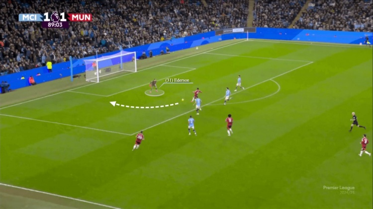 為了應(yīng)對曼聯(lián)的進攻,埃德森保持了一個較高的站位,但沒有進一步向前采取動作。當球進入曼城禁區(qū)之后,阿瑪?shù)路磻?yīng)迅速,帶球突破埃德森,小角度完成破門。