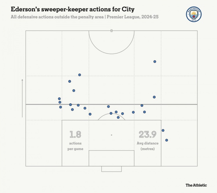 本賽季埃德森在禁區(qū)外活動位置分布圖