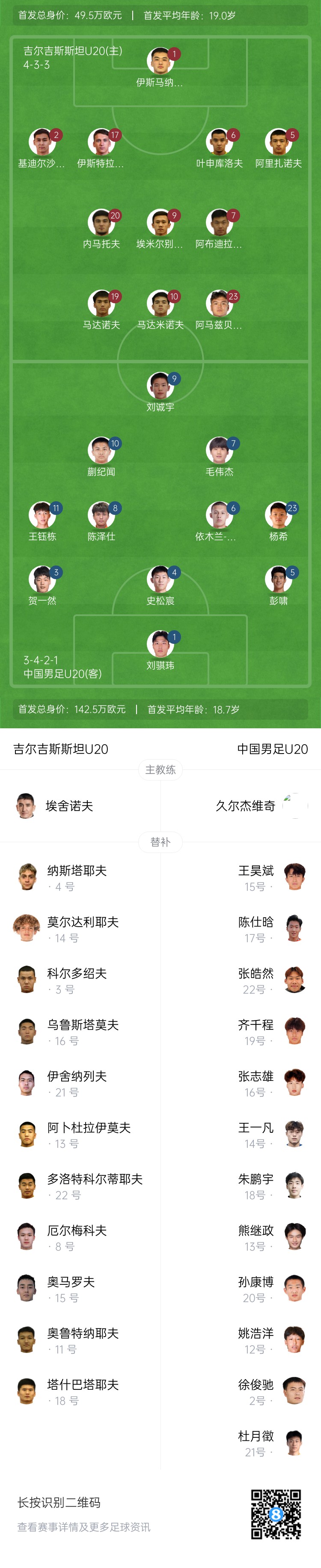 A組首輪比賽中,U20國足2-1擊敗卡塔爾U20,暫列小組第二;吉爾吉斯斯坦U20則以1-5慘敗于澳大利亞U20,暫列小組墊底。