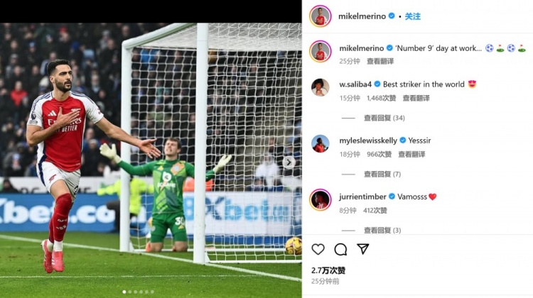 梅里諾首次客串中鋒便打進(jìn)2球,他也通過社媒曬出自己進(jìn)球后的慶祝照,并配文:“9號位上班日… ????????”