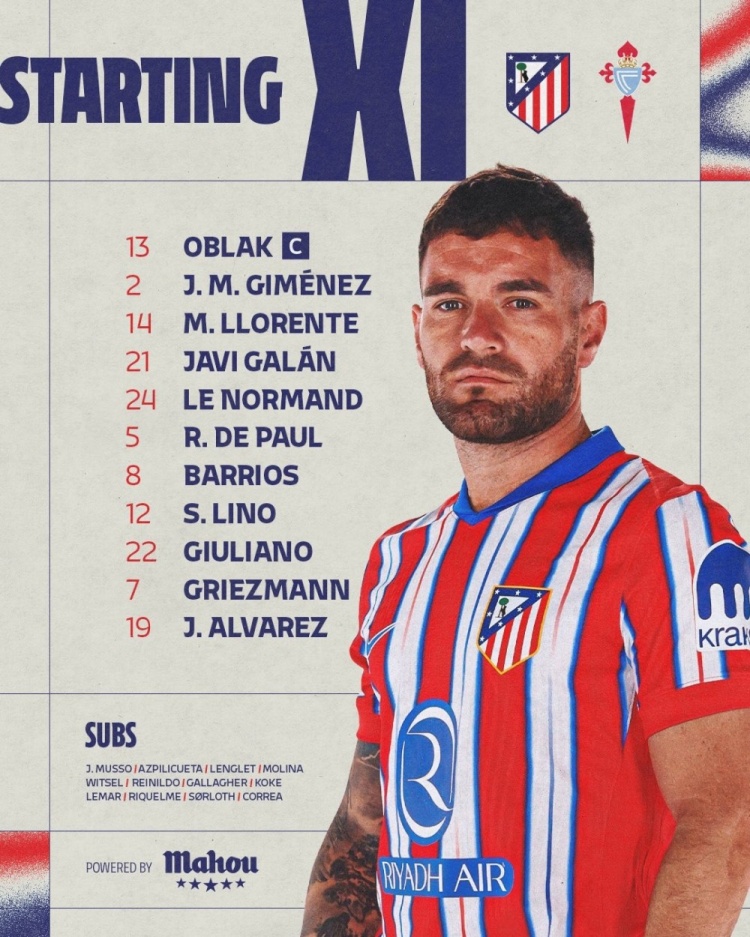馬競(jìng)首發(fā):13-奧布拉克、2-吉梅內(nèi)斯、14-馬科斯-略倫特、21-加蘭、24-勒諾爾芒、5-德保羅、8-巴勃羅-巴里奧斯、12-利諾、22-朱利亞諾-西蒙尼、7-格列茲曼、19-阿爾瓦雷斯