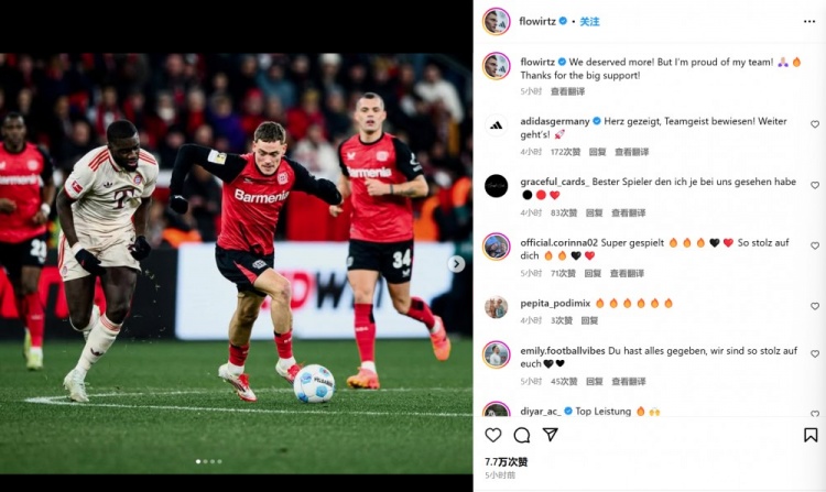 維爾茨也在賽后通過社媒曬出自己的比賽照,并配文:“我們配得上更多!但我仍然為全隊(duì)感到驕傲!感謝(主場(chǎng)球迷的)大力支持!”