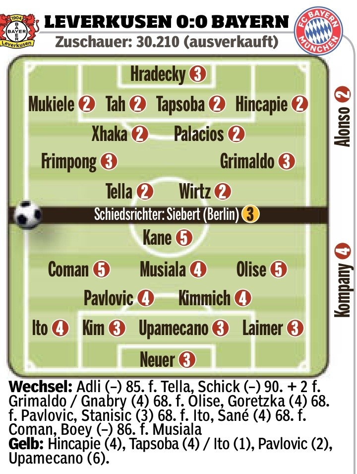 2月16日訊 德甲第22輪比賽,勒沃庫森主場0-0戰(zhàn)平拜仁,德國媒體《圖片報》對兩隊球員進行了評分。